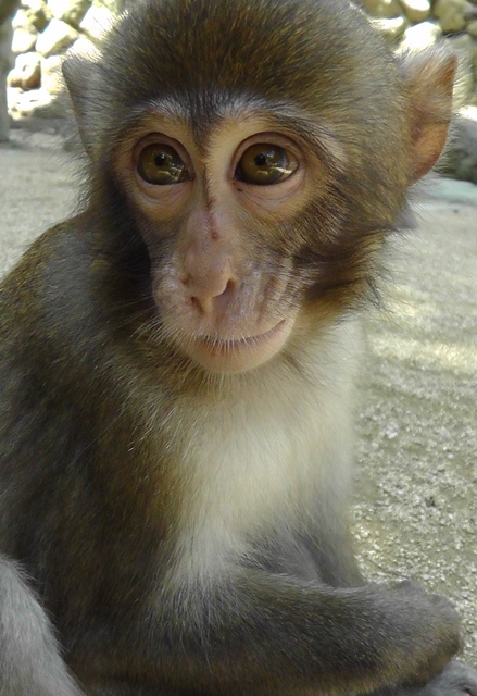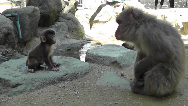 サル寄せ場にある「高崎山保育園」で小麦をほお袋に入れた0才児発見!