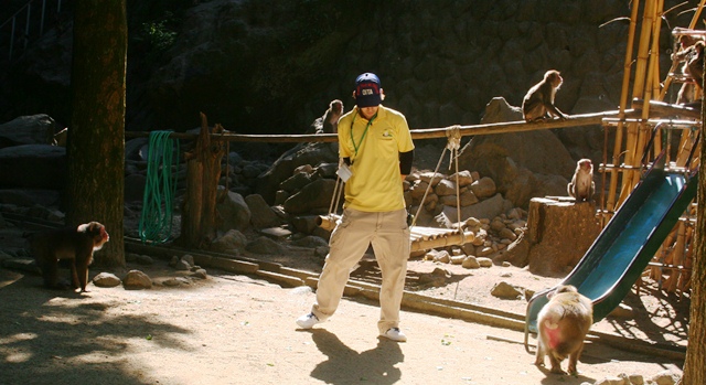 ↓スタッフが高崎山保育園に近づいたところ、ナンチュウとマクレーンがすごい勢いで走り寄って「ゴゴゴッ!」と威嚇しました。子ザルに何かされるのではないかと守りに入ったのです。